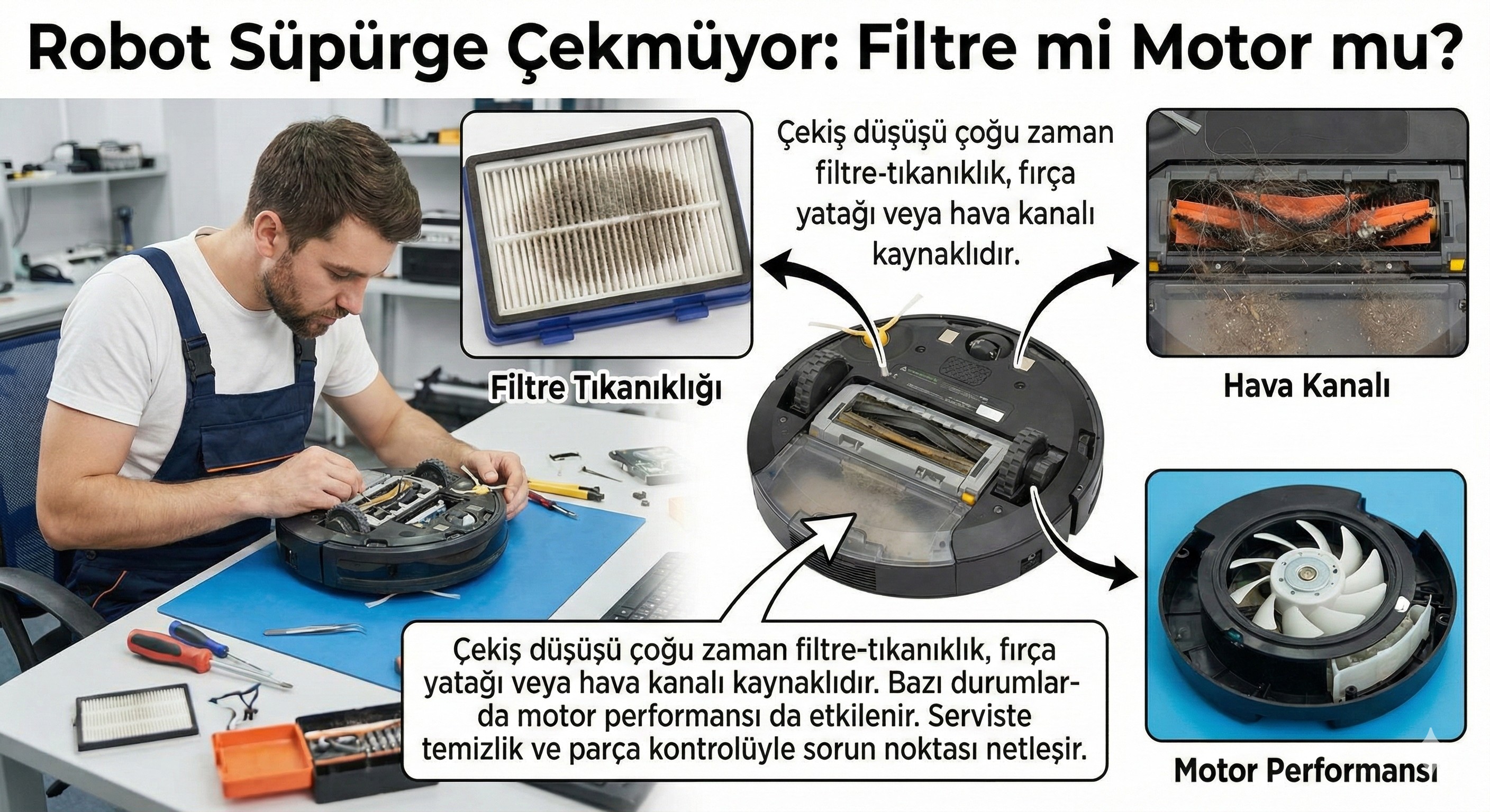Motor, batarya, sensör, su teması ve mekanik sorunlarda detaylı arıza tespiti ve onarım.